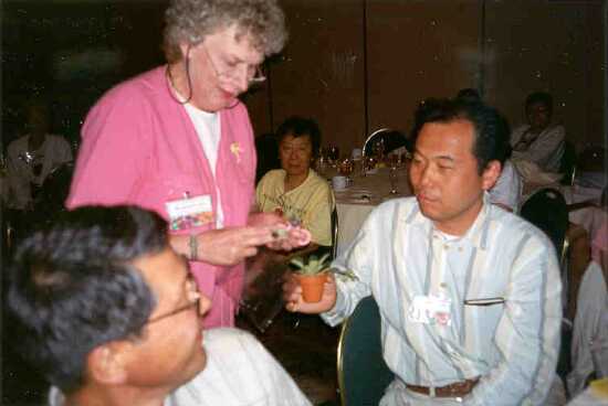 | Kazuo Horikoshi won the bid for a "fresh-cut" stolon of the new species Chirita gemella donated by Maryjane Evans | Judy Becker and Helen Freidberg discussing entries in the flower show room |