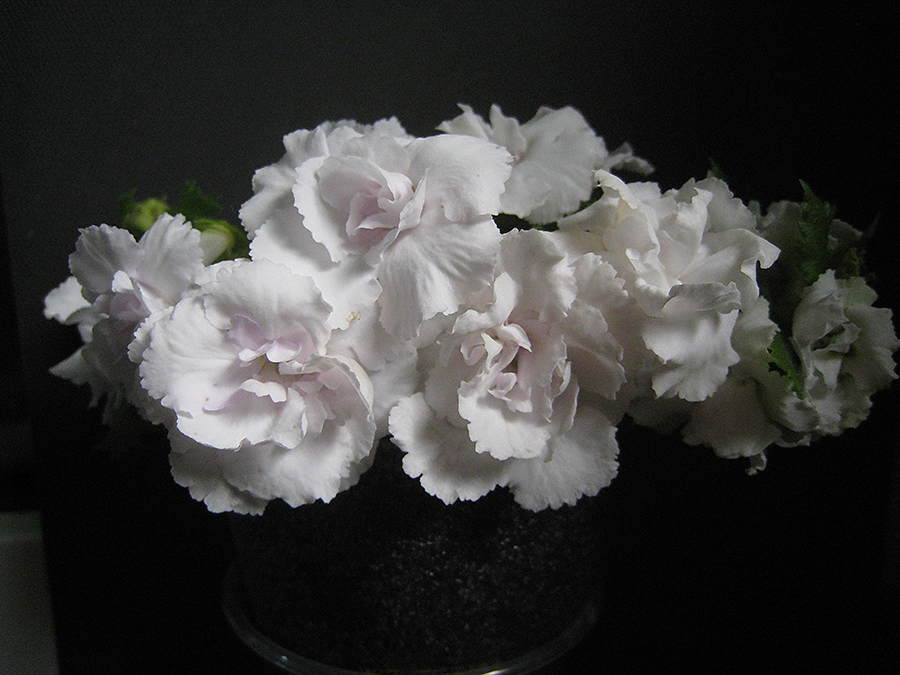 Achimenes ‘Omniyat’, 2024, IR242039, hybridized by Serge Saliba, Bucharest, Romania. (A. ‘SRG’S Maria’ x A. ‘White Glory’). Cross made 04.2022, seeds planted 09.2022, first flowering 028.2023. Sterile, reproducible only vegetatively. Erect habit, stem length 20 cm. Leaves medium green, 4 cm long, 3.5 cm wide, 2 cm petiole, ovate, acute tip, cuneate base, serrate margin. Calyx leafy, medium green, length 5 mm, length of the pedicel 1 cm, 1 flower per axil. Corolla salverform, double, 3 cm long, 6 cm wide, white. Very double white blooms sometimes have a very light blue center when a temperature drops, edges of the corolla are fringed making this hybrid a real masterpiece.