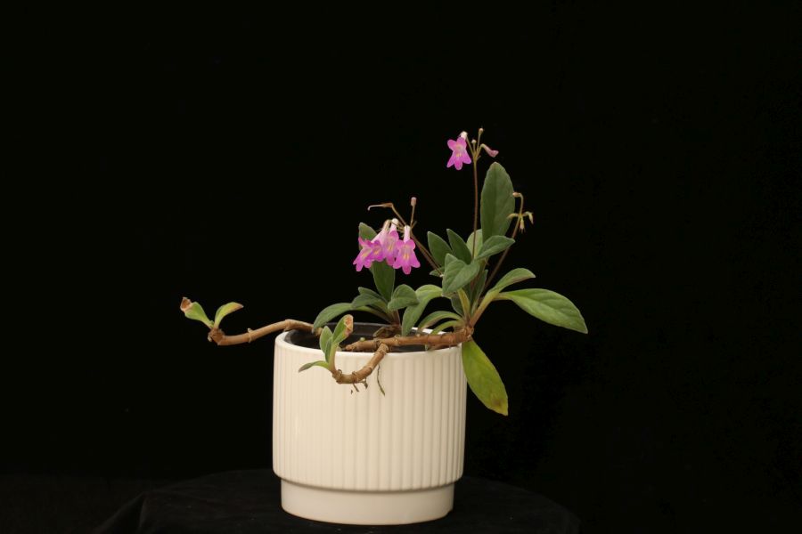 Primulina ‘Little Pink’, 2023, IR231885, hybridized by Haixia Yan, Qian Song, Dayan Tao, Shuming Luo; Guangxi Academy of Agricultural Sciences; Nanning, China. (P. longgangensis x P. hochiensis). Cross made 12.26.2019, seeds planted 01.10.2020, first flowering 10.24.2021. Sterile, reproducible only vegetatively. Basal rosette, acaulescent. Leaves moderate yellow green, 4.6-6.0 cm long, 1.6-2.4 cm wide, 1.6-4.4 cm petiole, linear with acute tip, cuneate base, entire to serrate margin, hairy. Calyx split, brown, 8-11 mm. Length of the pedicel 1.6-2.6 cm, 2-4 flowers per axil. Corolla salverform, 2.0-2.4 cm long, 0.7-1.0 cm wide, strong reddish purple. A vigorously growing plant, well adapted to extremely dry and poor conditions. Requires indirect sunlight and low humidity.