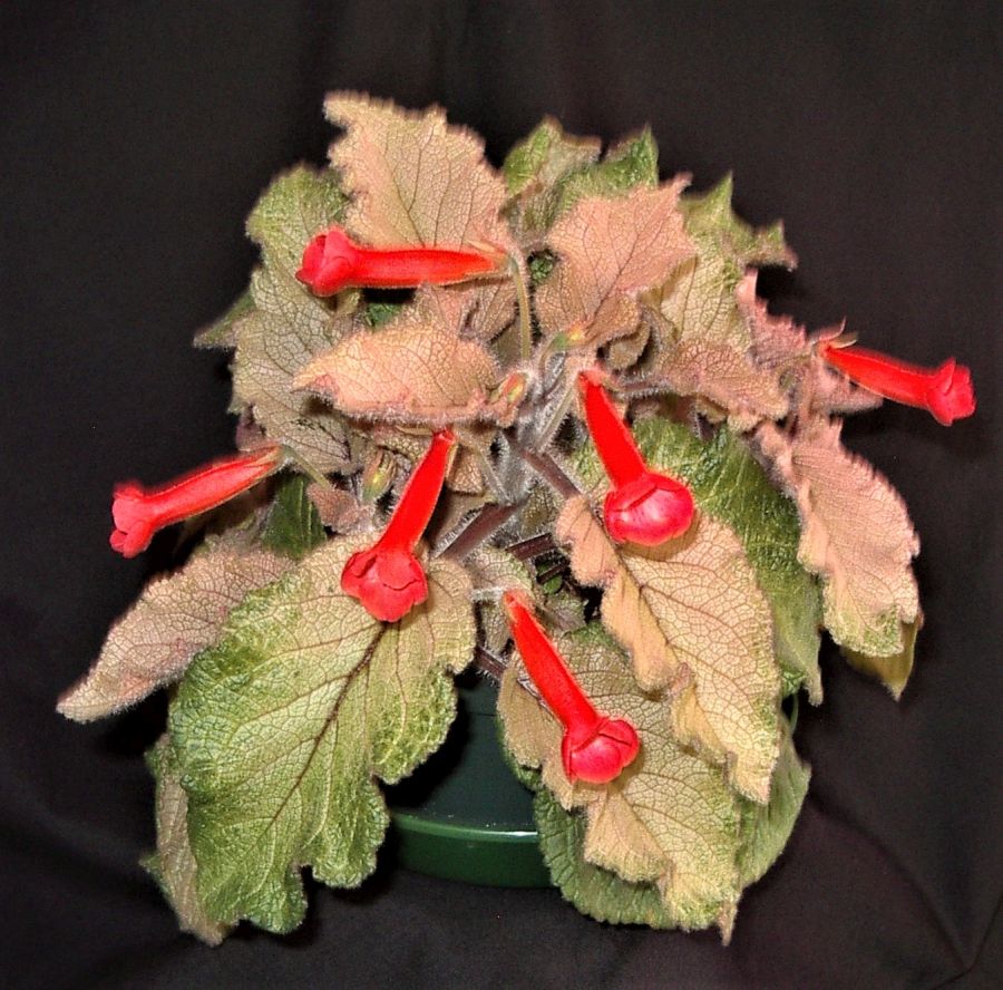 Sinningia ‘Peridots Fall Memories’, 2023, IR231874, registered by Iain James, Victoria, British Columbia, Canada. (S. ‘Peridots Patchwork Quilt’ x S. ‘Peridots Sand Pebbles’). Cross made 05.2019, seeds planted 11.2019, first flowering 06.2020. Fertile, reproducible only vegetatively. Basal rosette, stem length 10 cm. Leaves dark green (RHS136A) shading into dark yellow brown (RHS163B) and light yellow-brown (RHS160B), 12.5 cm long, 7.5 cm wide, 10 cm petiole, ovate with acute tip, cordate base, undulate margin, bullate. Calyx split, brown green (RHS152D), 12.5 mm. Length of the pedicel 7.5 cm. 3 flowers per axil. Corolla salverform, 5 cm long x 2.5 cm wide, red (RHS44A) shading into orange red (RHS41B).