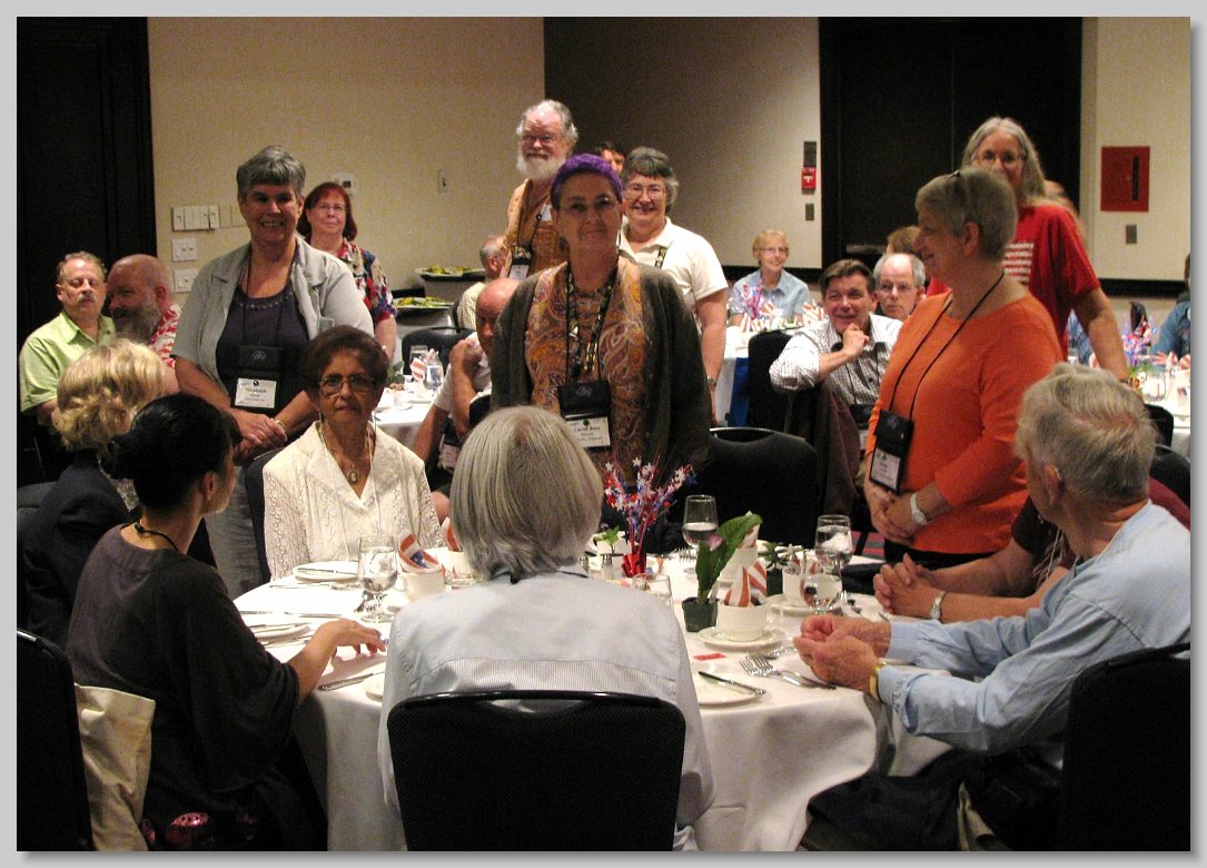 Attendees socializing at the evening dinner dinner (Mary Helen Maran, Harry Branson, Judy Smith, Betsy Branson, Betsy Gottshall, Jeff and Edie Chapman, Stephen Maciejewski)