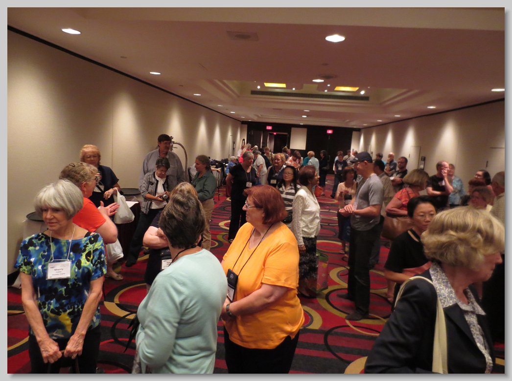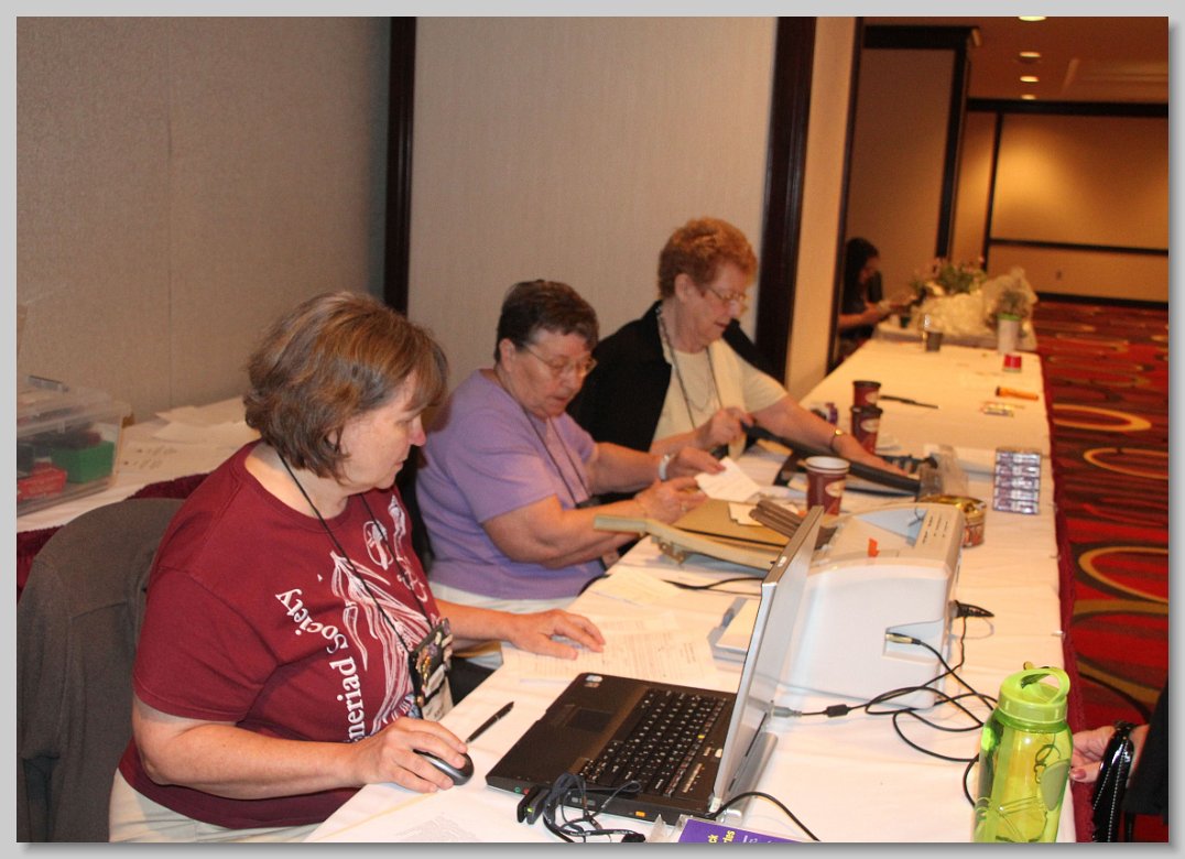 Exhibitors preparing their entries for show (front left: Marina De Souza, first-time convention attendee, and Paul Kroll, Artistic Reservations and Schedule Co-Chair)