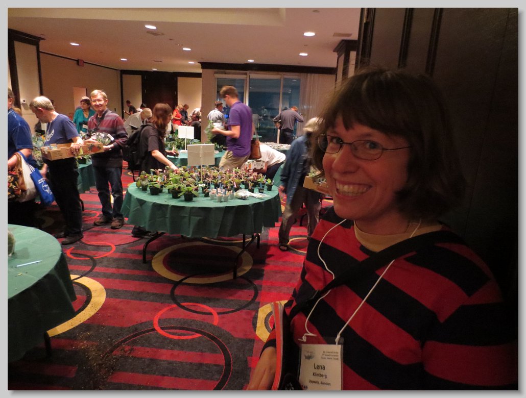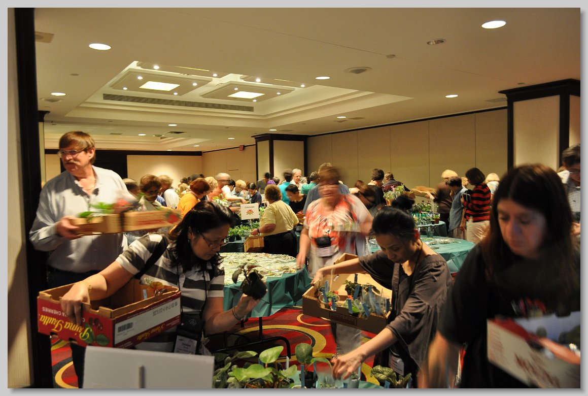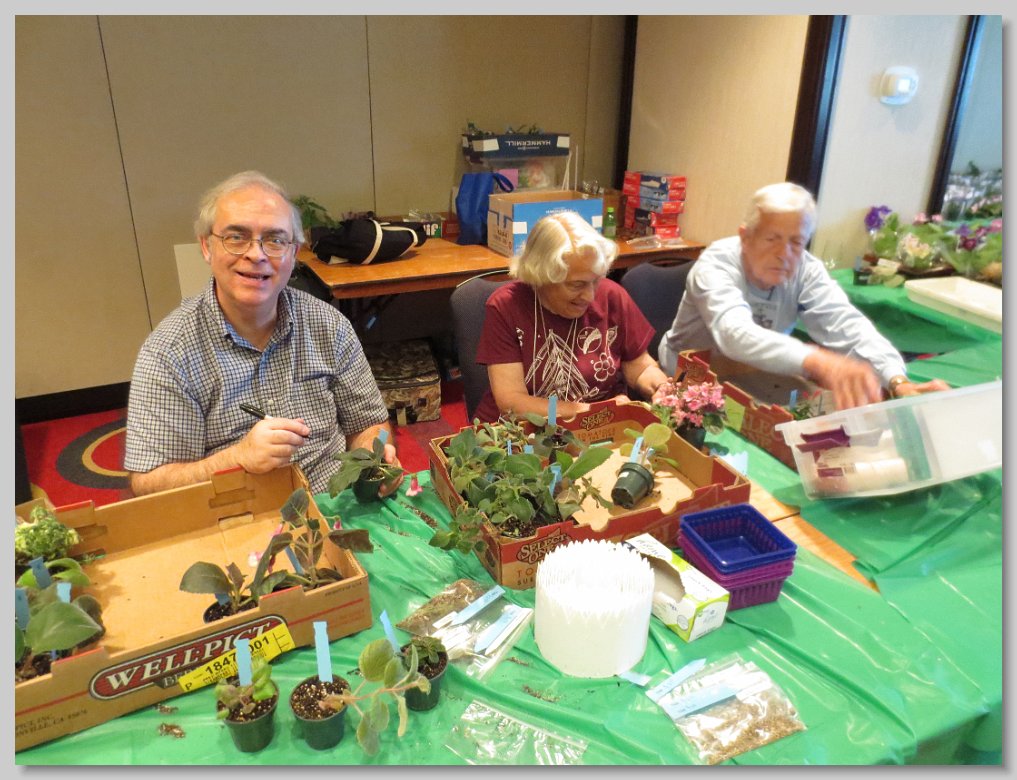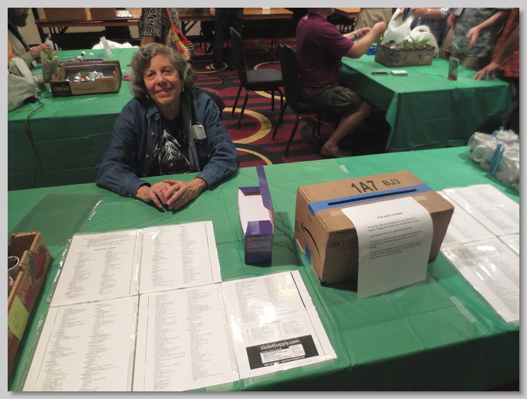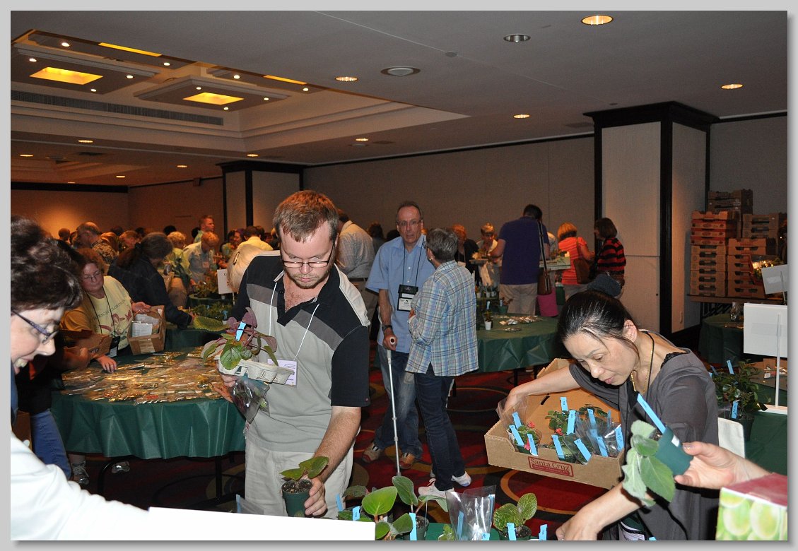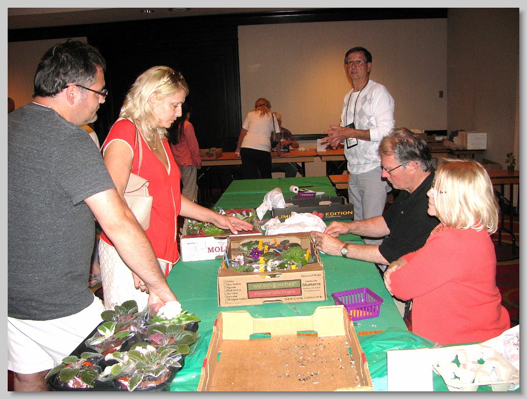 Jeanne Katzenstein presenting a box of sale plants donated by the Society to Janique Perreault, curator of the gesneriad collection at the Montreal Botanical Garden