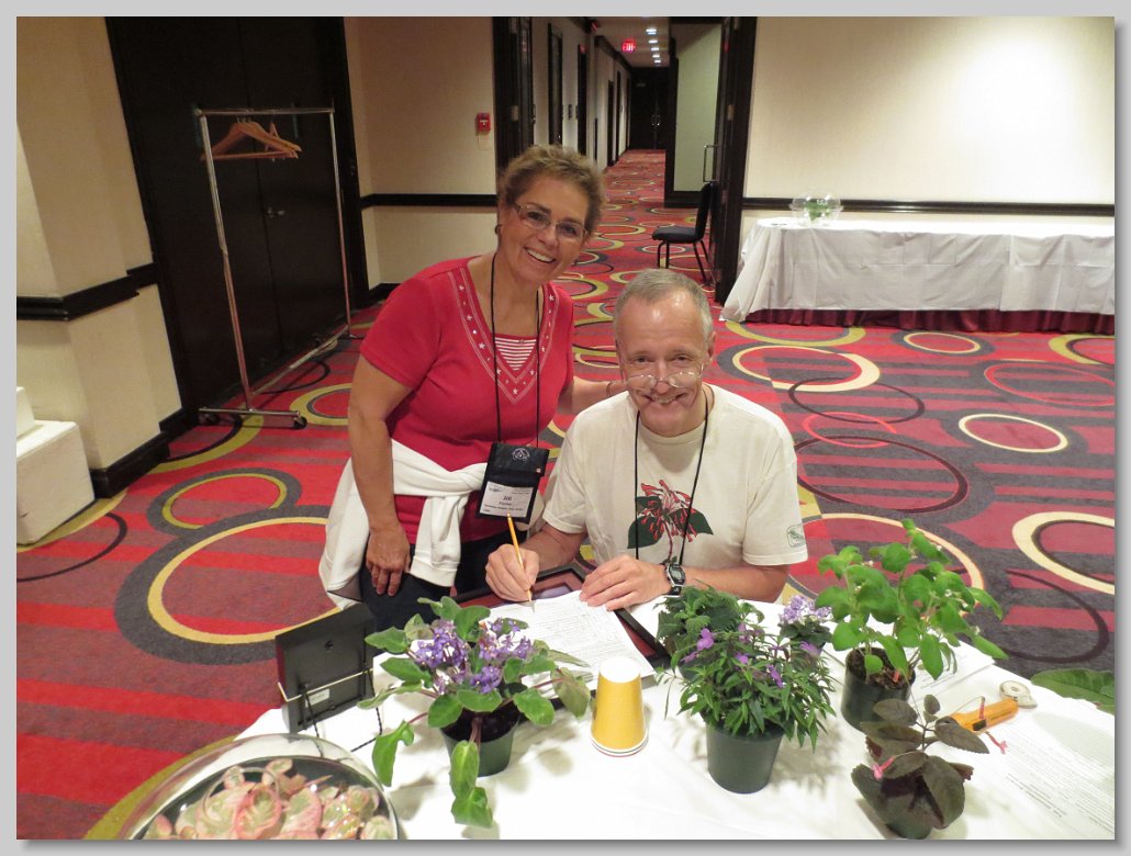Promoting gesneriad wear: Fay Wagman, Chair of Membership Publicity Promotion, with help from Convention Registrar Mary Helen Maran