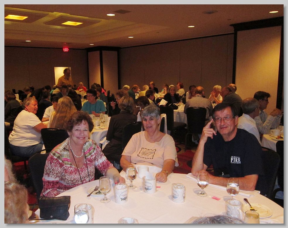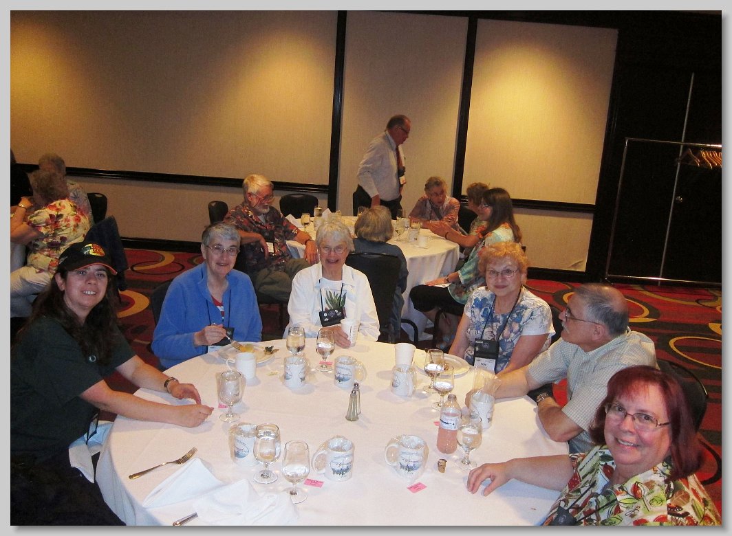 Attendees from California, Washington, Pennsylvania, and Illinois socializing at dinner (Leslie Cox, Sally Robinson, MJ Tyler, Edie and Jeff Chapman, Dale Martens)