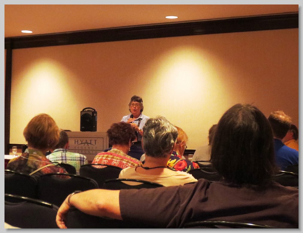 The forum was moderated by Michael Riley with panel members Dee Stewart (seen standing), Bob Stewart, Carol Ann Bonner, and Carolyn Ripps