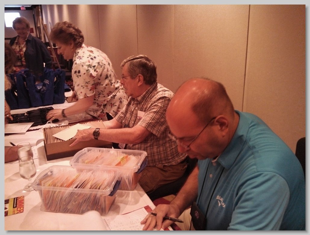 Convention Registrar Mary Helen Maran (standing) assisted by Stan Sudol (center) and Jay Sespico