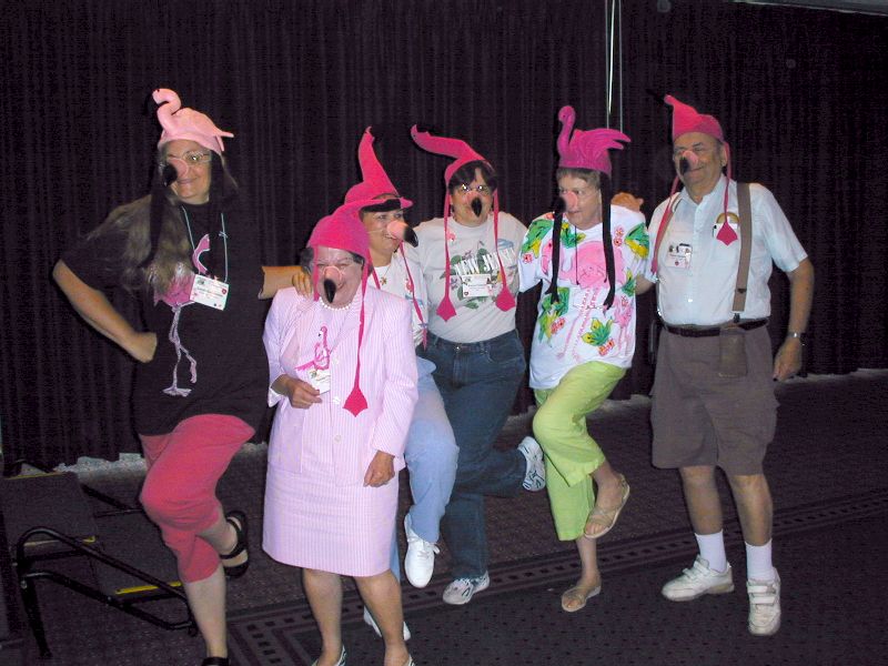 Some of the Frelinghuysen Flock at the Saturday morning chapter breakfast inviting everyone to Convention 2002 in Morristown, New Jersey