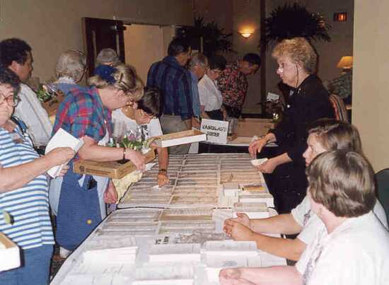 | Pat Richards and assistant at the Publications Sales table | Richard Holder (front and center)surveying the crowd before the opening of plant sales |