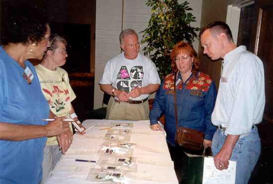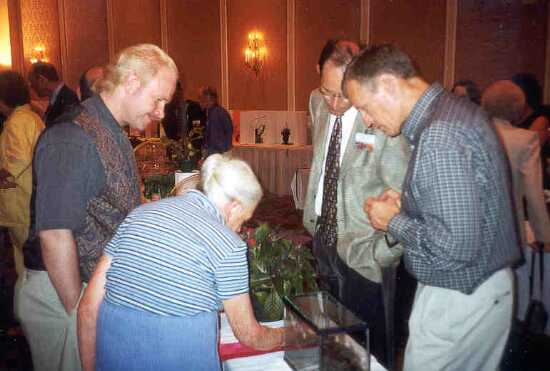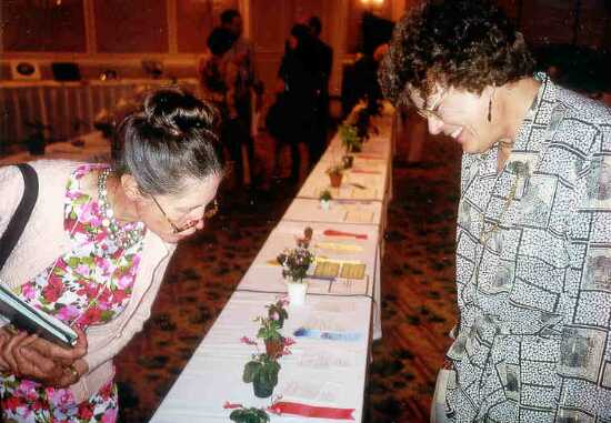 | Kazuo Horikoshi won the bid for a "fresh-cut" stolon of the new species Chirita gemella donated by Maryjane Evans | Judy Becker and Helen Freidberg discussing entries in the flower show room |